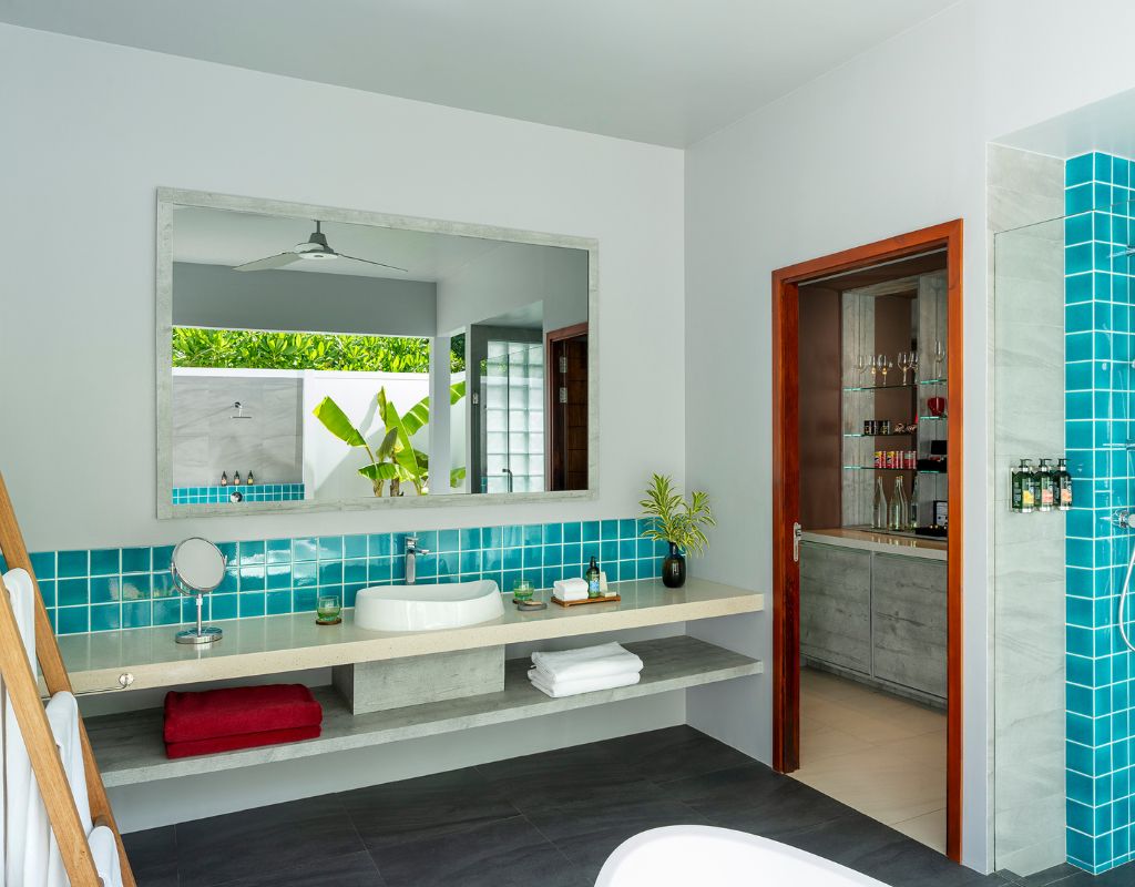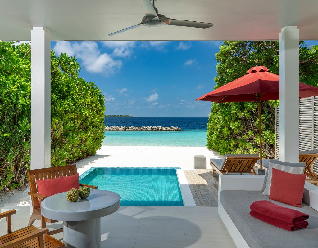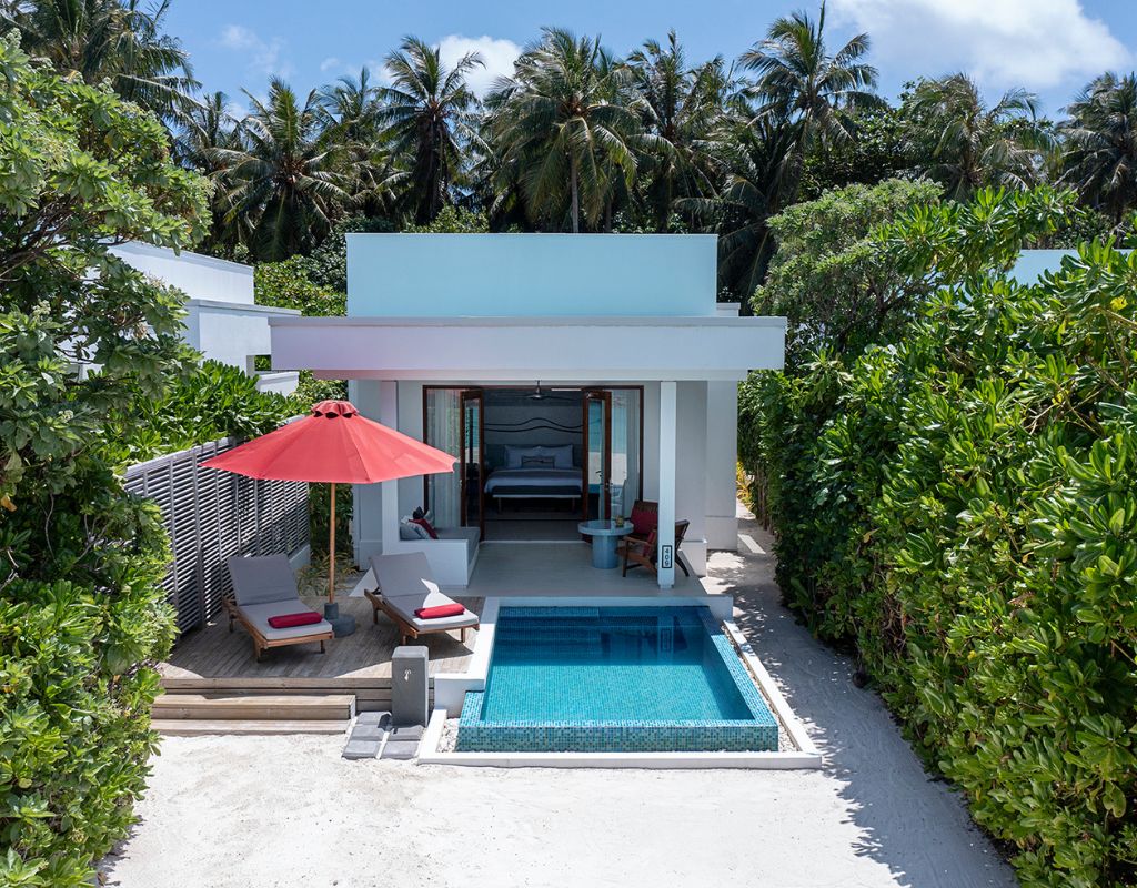 Just steps from the shoreline, the Beach Villas with Pool at Dhigali Maldives offer a lush garden pool retreat with direct beach access and views over the house reef. These 121 sqm villas feature a king-sized bed and a daybed, allowing space for romance or a small family. A standout feature is the private plunge pool shaded by native greenery; inside, open-air and indoor bathrooms with rainfall showers and freestanding bathtubs let the tropics in.