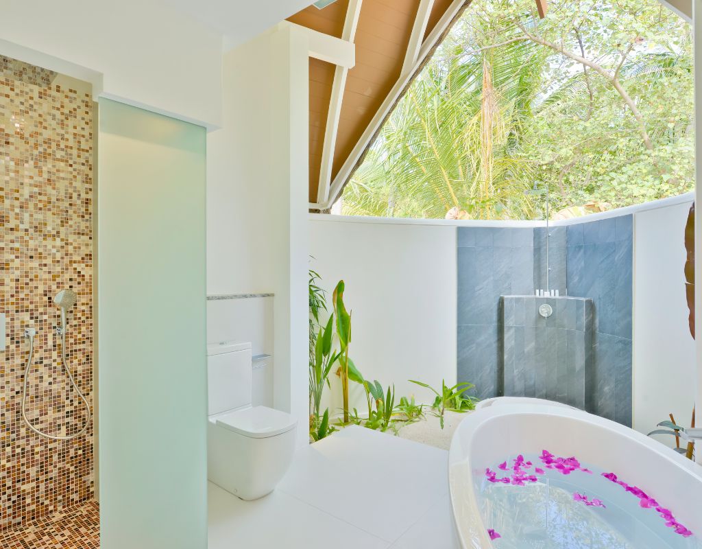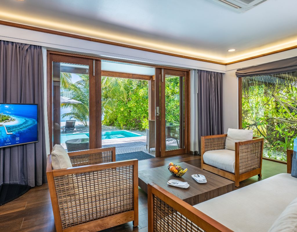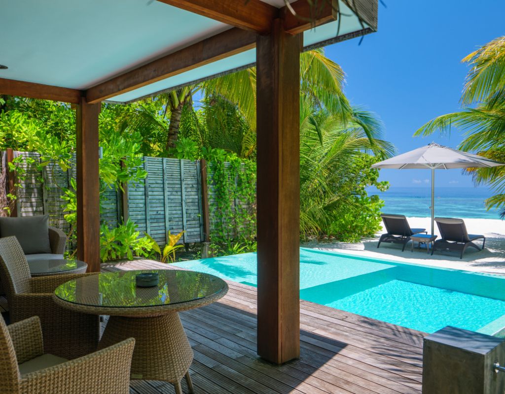 The Duplex Pool Villas at Kandolhu Maldives offer a luxurious two-storey retreat, ideal for guests seeking spaciousness and privacy. Spanning 150 sqm, these villas are located on the west side of the island, providing uninterrupted ocean views. The ground level features a dedicated living area with a daybed, a large wardrobe, and a garden bathroom equipped with a shower, twin vanity, freestanding bath, and a separate outdoor shower. The front veranda offers an outdoor daybed and dining area, leading to a separate terrace with an 18 sqm pool, sun loungers, and a sun umbrella. The upper level houses a spacious and airy bedroom with a king-sized bed and a second bathroom. The balcony features an outdoor daybed and seating area, perfect for relaxing while enjoying the ocean breeze.