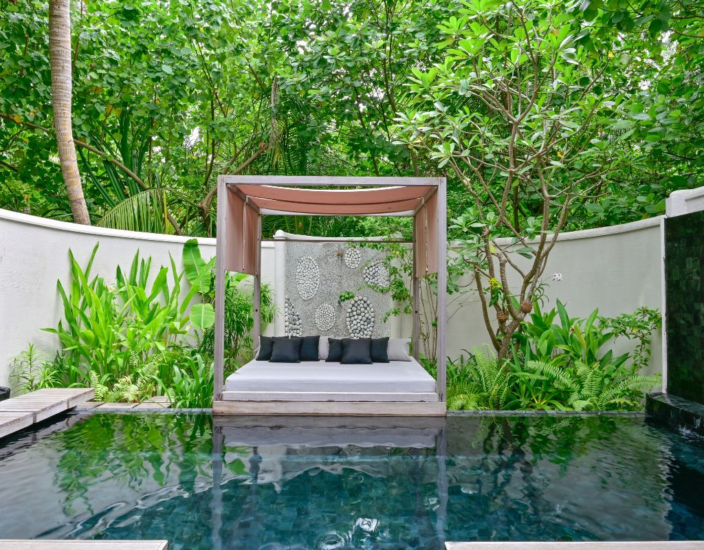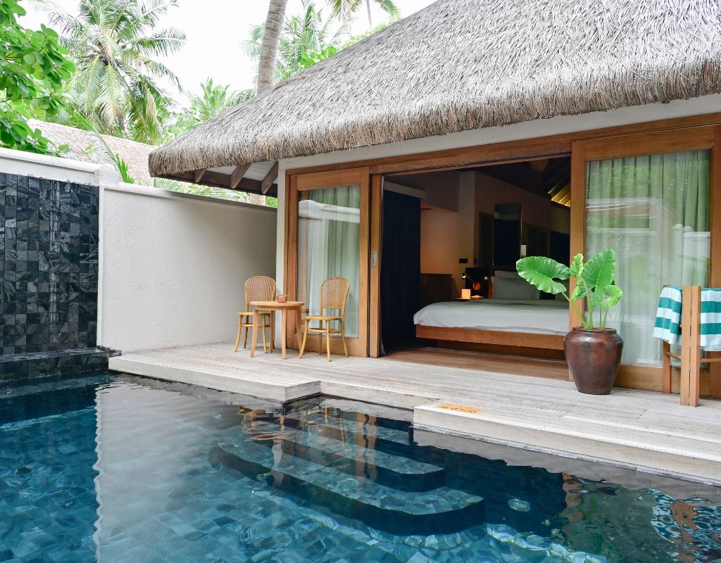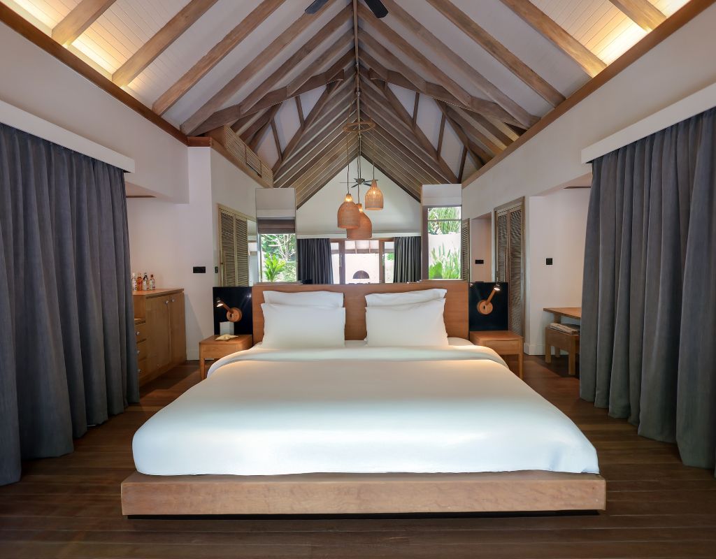The Grand Premier Beach Villa with Pool at Coco Bodu Hithi offers 300 sqm of luxurious beachfront living, blending tropical elegance with modern comfort. Each villa features a king-sized bed, a sunken living area, and a spacious open-air lounge, providing ample space for relaxation. The private courtyard is a highlight, complete with a plunge pool and daybed, perfect for unwinding in privacy. Guests can enjoy both indoor and outdoor showers, enhancing the connection with nature.