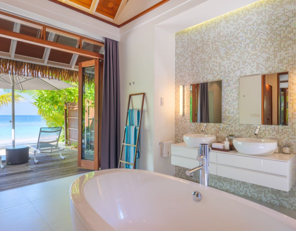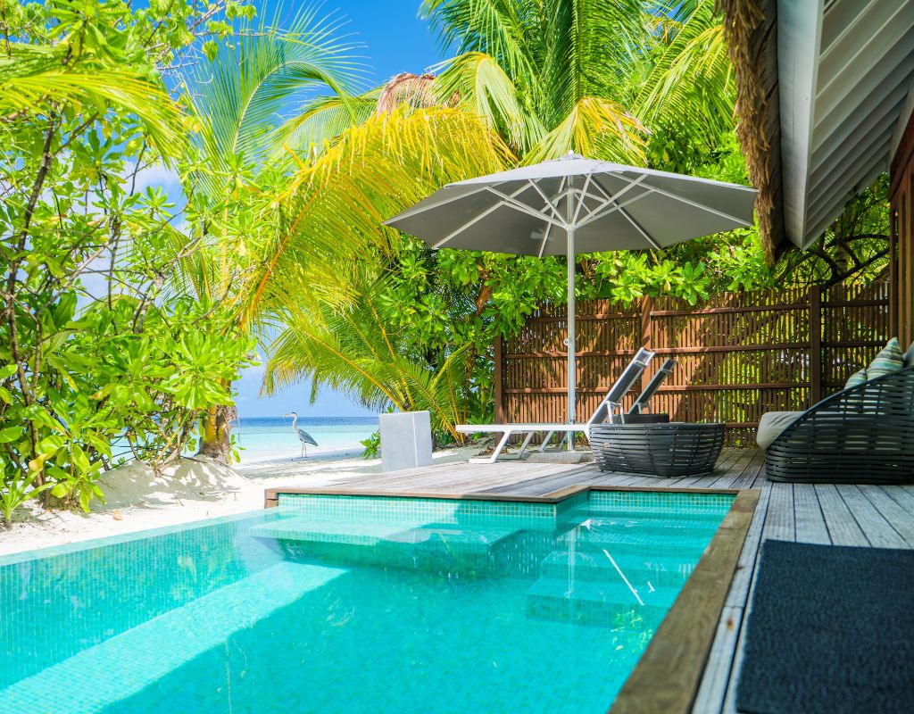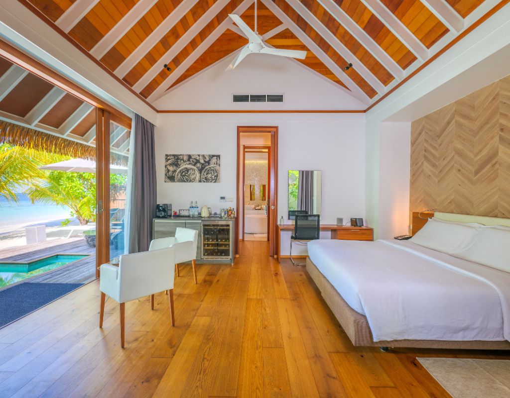 The Pool Villas at Kandolhu Maldives offer a luxurious retreat, ideal for guests seeking privacy and comfort. Spanning 150 sqm, these villas are situated on the eastern side of the island, providing direct access to the beach. Each villa features a spacious bedroom with a king-sized bed facing the pool and the blue lagoon beyond. The expansive wardrobe leads to a large open-air garden bathroom equipped with a freestanding bath, shower, twin vanity, and an outdoor garden shower. The large veranda includes an outdoor daybed, while the oversized deck houses a 9 sqm pool, sun loungers, a sun umbrella, and a dining area, perfect for relaxation and enjoying the tropical surroundings.