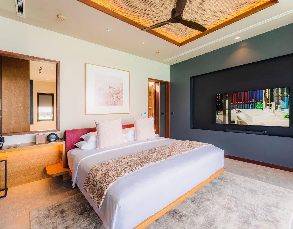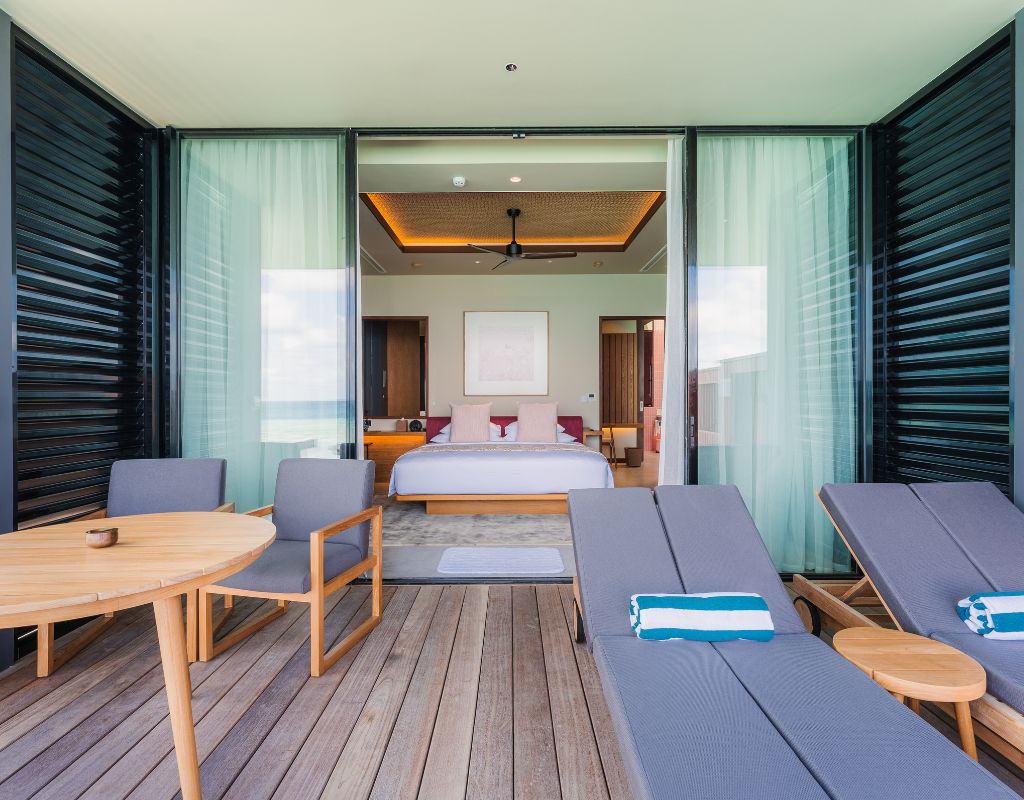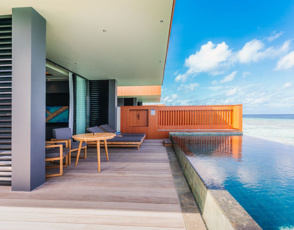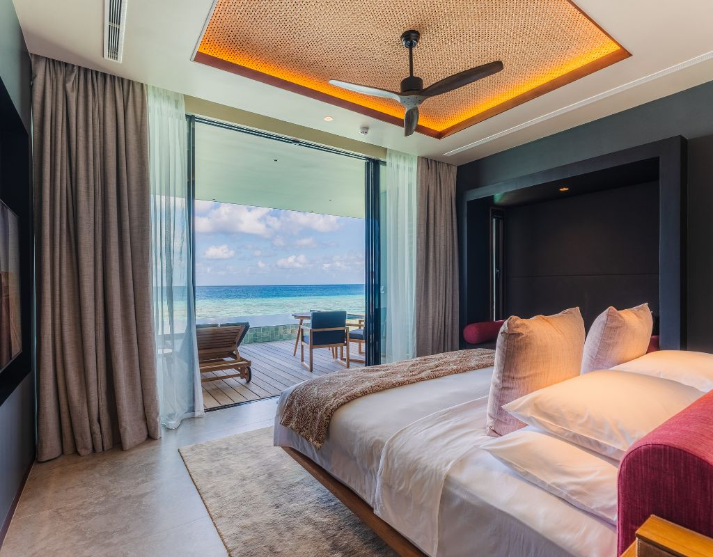 The Sunset Ocean Pool Villa 2 Bedroom at Veligandu Island Resort offers a luxurious overwater escape designed for families or groups. Located on the northeast side of the island, the villa provides stunning sunset views and direct access to the house reef. Inside, two master bedrooms feature king-sized beds, elegant interiors, and stylish bathrooms with ocean-view tubs and rain showers. A spacious living area and private deck with a plunge pool make it perfect for relaxing, dining, and enjoying the Indian Ocean panorama.