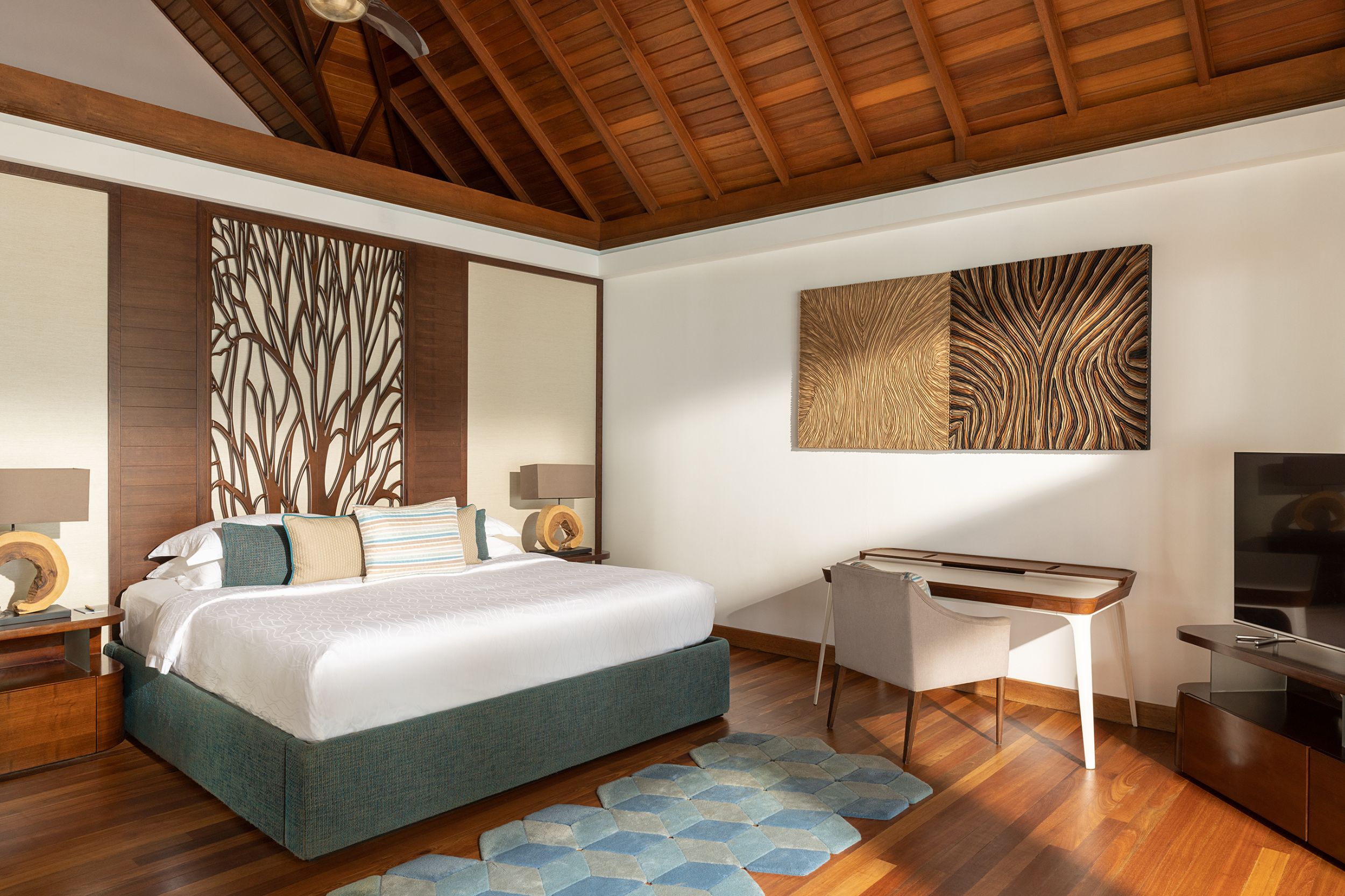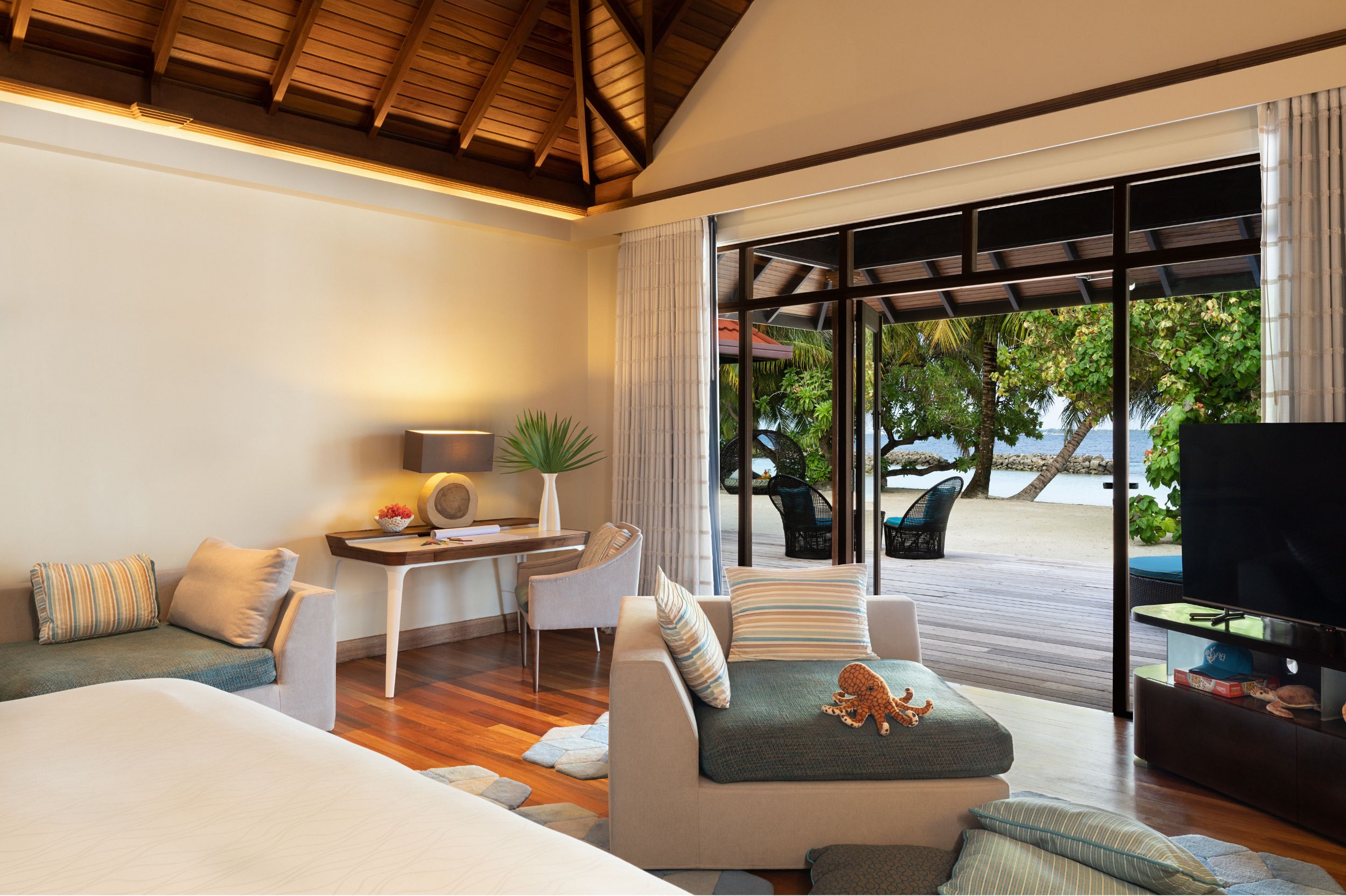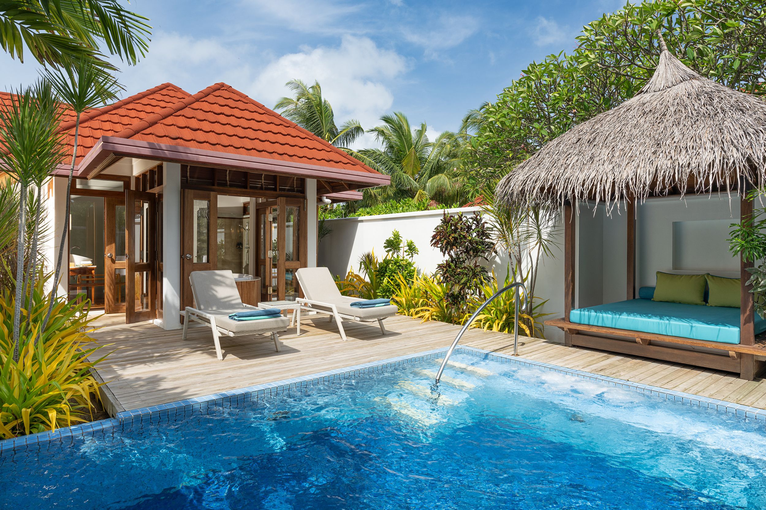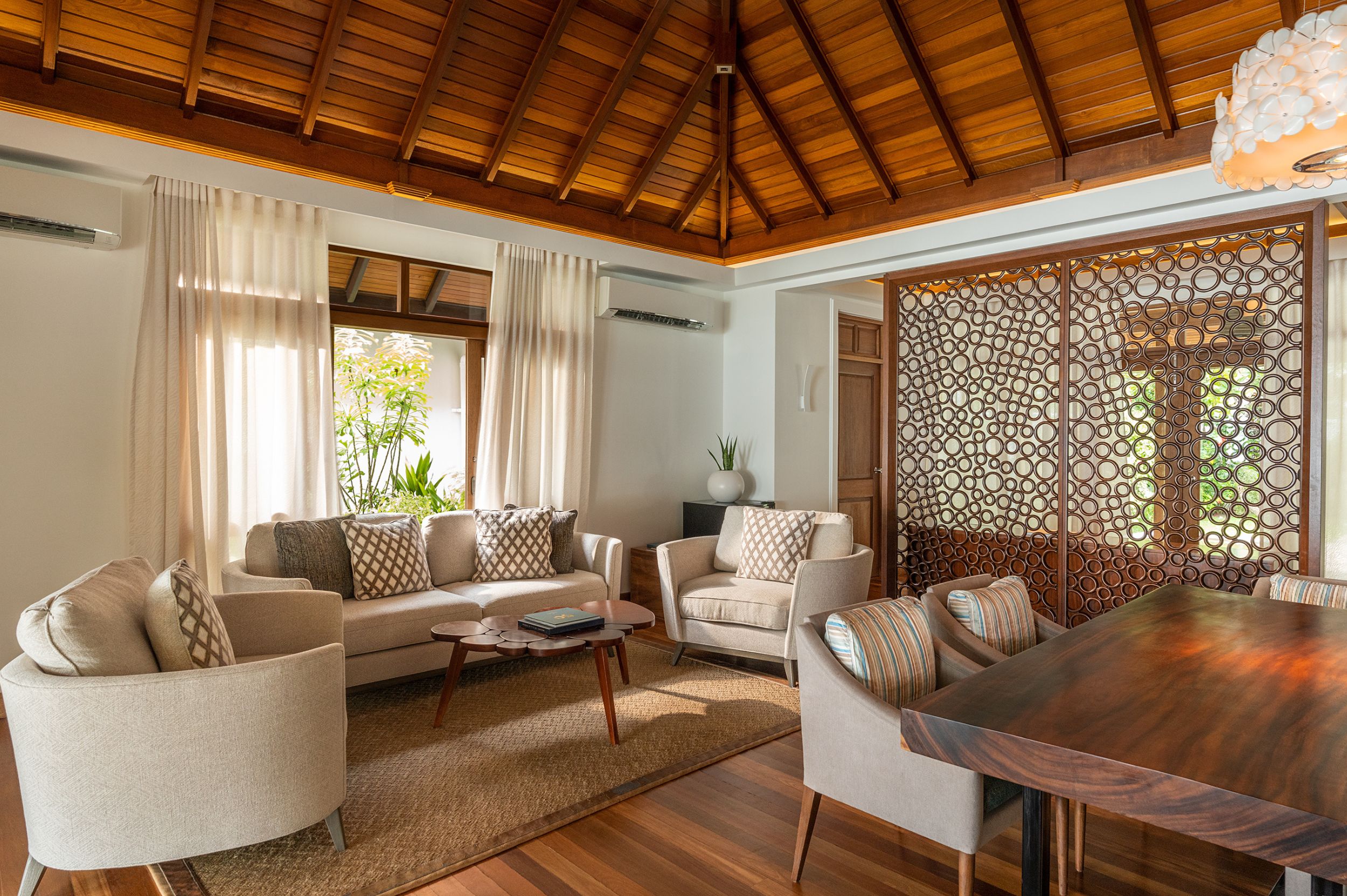 The Two Bedroom Kurumba Residence is a luxurious beachfront villa that offers unparalleled privacy and space. Spanning 768 sqm, this expansive villa features two large bedrooms with king-sized beds, each with its own private bathroom. The open-plan living area includes a dining room, sitting area, foyer, pantry, and kitchenette, providing all the comforts of home. The villa boasts two private outdoor pools/Jacuzzis, two private gazebos with daybeds, and a separate living space with a wine cellar, ensuring a truly indulgent stay. The wrap-around deck spills down to the beach and sea, offering breathtaking views and direct access to the beach.