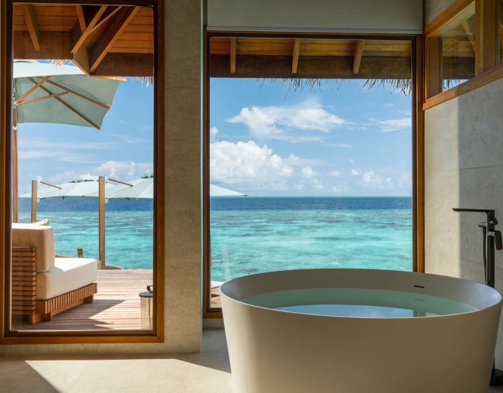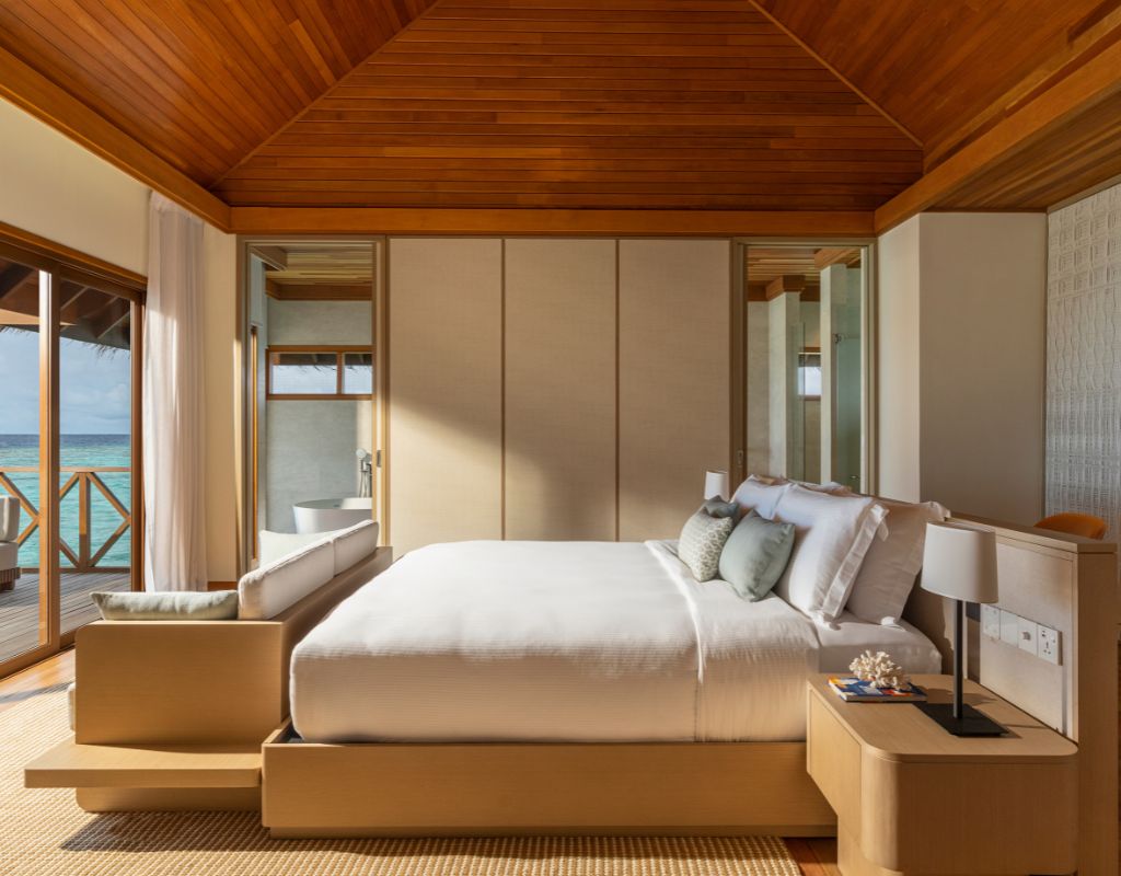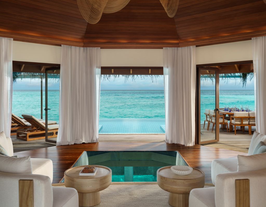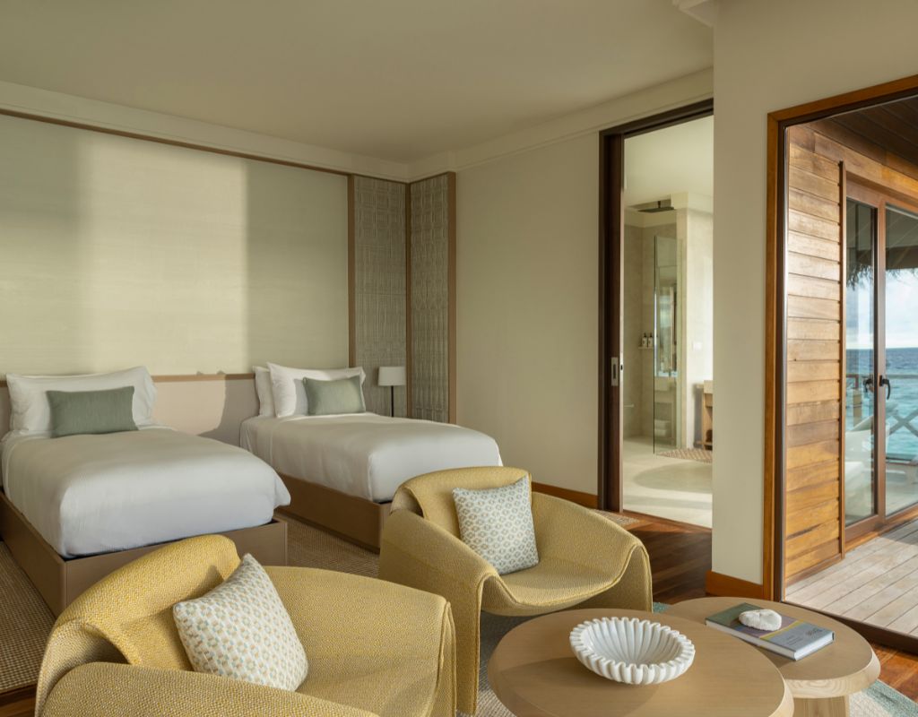 The Two‑Bedroom Ocean Pavilion with Pool at Huvafen Fushi spans 330 sqm of overwater luxury, offering uninterrupted sunset views and direct lagoon access. This expansive pavilion features two spacious bedrooms, two bathrooms, and a seamless indoor‑outdoor living experience. The centerpiece is a freshwater swimming pool that extends through the pavilion, complemented by a private deck with loungers and a dining area. I
