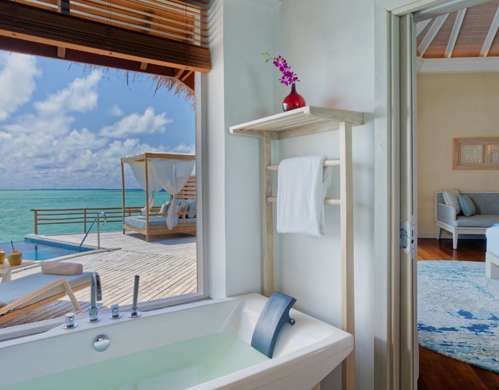 The Water Pool Villas at Baros Maldives offer an intimate overwater retreat, each featuring a 20 sqm private infinity pool that seamlessly blends with the turquoise lagoon. Guests can relax on the spacious sun deck, complete with a canopied daybed, or descend the private stairs directly into the crystal-clear waters for an immersive marine experience. Inside, the villas are elegantly furnished with rich teak floors, comfortable furniture, and luxurious bedding, complemented by a library of books and indoor games for relaxation.
