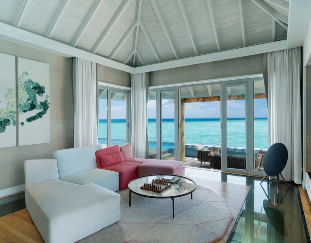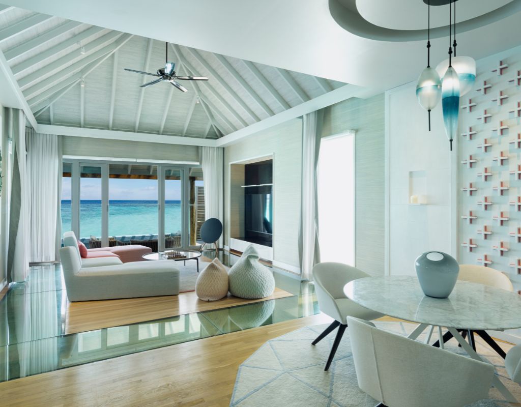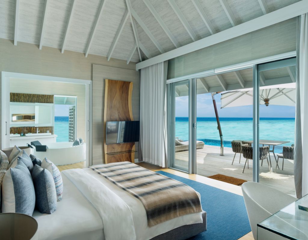 Perched at the end of a long jetty, the Water Suite at Velassaru Maldives offers the ultimate overwater retreat. Spanning 270 sqm, this secluded suite features seamless indoor-outdoor living with breathtaking turquoise views. The spacious bedroom is complemented by a luxurious bathroom with a double vanity, bathtub, and separate shower.