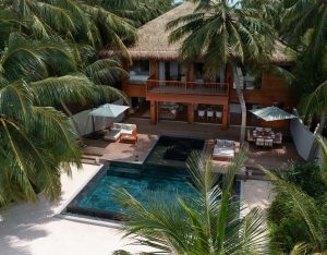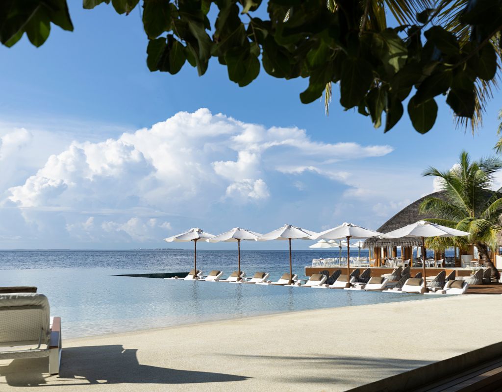 This expansive 800 sqm pavilion at Huvafen Fushi is made for families or friends travelling together. Perched on the beach with sweeping ocean views, it features three bedrooms and three bathrooms, ensuring plenty of space and privacy. The design includes a freshwater infinity pool framed by lush tropical greenery, outdoor spa treatment area, multiple decks and sun loungers