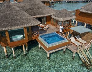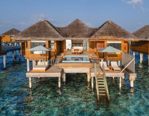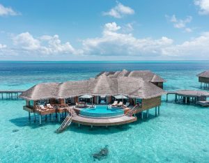 The Two‑Bedroom Ocean Pavilion with Pool at Huvafen Fushi spans 330 sqm of overwater luxury, offering uninterrupted sunset views and direct lagoon access. This expansive pavilion features two spacious bedrooms, two bathrooms, and a seamless indoor‑outdoor living experience. The centerpiece is a freshwater swimming pool that extends through the pavilion, complemented by a private deck with loungers and a dining area. I