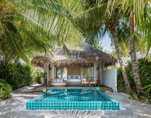 Step into a haven of shoreline luxury, where 196 sqm of space opens onto soft sand and shimmering ocean views at Huvafen Fushi. This Deluxe Beach Bungalow with Pool features two freshwater plunge pools—one beside your deck and one within the private outdoor bath—so you can choose your moment of calm. The bungalow is furnished with a king-sized bed, open-air bathroom with bathtub and waterfall shower, and has direct beach access.