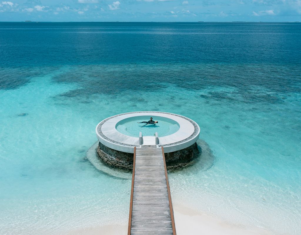 Perched above the lagoon with expansive views of the Indian Ocean, the Ocean Bungalow with Pool at Huvafen Fushi is a one-bedroom sanctuary that blurs the lines between sky, water and rest. Spanning 160 sqm, it features a private infinity pool and a multi-tiered deck where you can lounge, dine, or dip in direct access to the ocean.