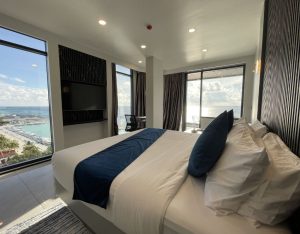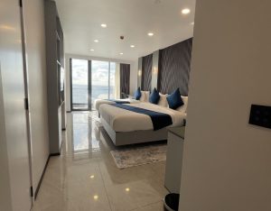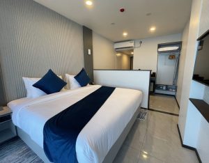 The Honeymoon Suite with Jacuzzi at iCom Blue Seaview offers a romantic and spacious stay with a king bed, private balcony, and sea views. It features a private jacuzzi and modern amenities, making it ideal for couples seeking a comfortable and relaxing island escape.
