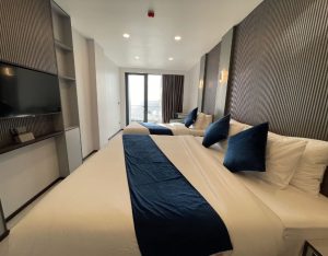 The Deluxe Triple Room with Balcony & Sea View at iCom Blue Seaview is a spacious room designed for up to three guests, featuring a comfortable layout with a king bed and a single bed. It comes with a private balcony offering sea views and modern in-room amenities, making it ideal for small families or groups.