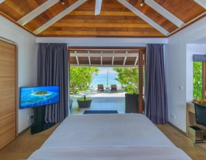 The Beach Villas at Kandolhu Maldives offer a serene and private retreat, ideal for guests seeking comfort and convenience. Spanning 85 sqm, these villas are located on the western shores of the island, providing direct access to the beach. Each villa features a king-sized bed, a spacious open-air garden bathroom with a jetted bathtub, shower, twin vanity, and a second outdoor shower set in the garden.