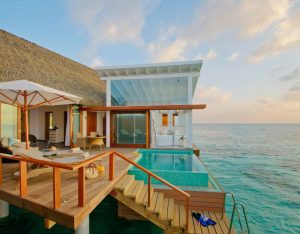 The Ocean Pool Villas at Kandolhu Maldives offer a luxurious overwater retreat, ideal for guests seeking privacy and comfort. Spanning 90 sqm, these villas are positioned to face the sunset, providing uninterrupted views of the Indian Ocean. Each villa features an oversized bedroom with a king-sized bed, a daybed, and a walk-in wardrobe. The open and airy bathroom includes a shower, twin vanity, and a bathtub, with a sliding door that opens up to the outdoor deck. The expansive and completely private deck is equipped with sun loungers, a sun umbrella, and a plunge pool (7 sqm), perfect for relaxation while enjoying the ocean breeze.