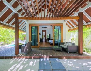 The Pool Villas at Kandolhu Maldives offer a luxurious retreat, ideal for guests seeking privacy and comfort. Spanning 150 sqm, these villas are situated on the eastern side of the island, providing direct access to the beach. Each villa features a spacious bedroom with a king-sized bed facing the pool and the blue lagoon beyond. The expansive wardrobe leads to a large open-air garden bathroom equipped with a freestanding bath, shower, twin vanity, and an outdoor garden shower. The large veranda includes an outdoor daybed, while the oversized deck houses a 9 sqm pool, sun loungers, a sun umbrella, and a dining area, perfect for relaxation and enjoying the tropical surroundings.