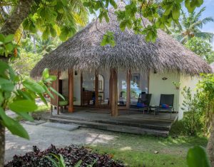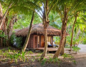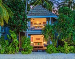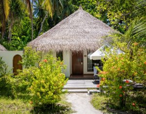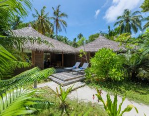 Nestled among lush greenery just steps from the lagoon, the Beach Villa at Kuramathi offers the perfect balance of seclusion and beachside living. Ideal for couples or small families, these villas accommodate up to three adults or two adults with a child. Each villa features a king-sized four-poster bed, a semi-open-air bathroom with a rainfall shower, and a private wooden deck furnished with sun loungers and a daybed for relaxing outdoors.