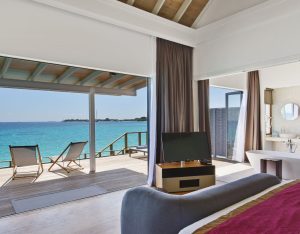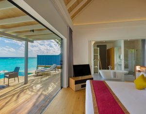 Perched in the heart of Kuramathi’s expansive turquoise lagoon, the Deluxe Water Villa offers an intimate retreat with panoramic ocean views. Designed for couples seeking luxury and privacy, it features a king-sized bed and a daybed, complemented by a spacious bathroom with a freestanding bath and twin vanities. The villa opens onto an expansive deck with steps leading directly into the azure waters, perfect for swimming or sunbathing.