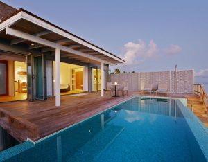 Elevated above the turquoise lagoon, the Water Villas with Pool at Kuramathi offer an intimate retreat with panoramic ocean views. Designed for couples seeking luxury and privacy, each villa features a king-sized bed, an indoor daybed, and a semi-open-air bathroom with twin vanities and a rainfall shower. The expansive two-tiered sundeck includes a private pool (18sqm), sun loungers, deck chairs, and a dining table, perfect for unwinding while watching the sunset.