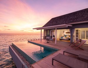 Perched on the edge of the renowned Kuramathi sandbank, the Thundi Water Villa with Pool offers an unparalleled Maldivian experience. These villas mirror the Water Villas with Pool in design and size, yet provide an enhanced experience with their prime location. Each villa features a king-sized bed, an indoor daybed, and a semi-open-air bathroom with twin vanities, a freestanding bath, and a rainfall shower. The expansive two-tiered sundeck includes a private pool (18sqm), sun loungers, deck chairs, and a dining table, perfect for unwinding while watching the sunset.